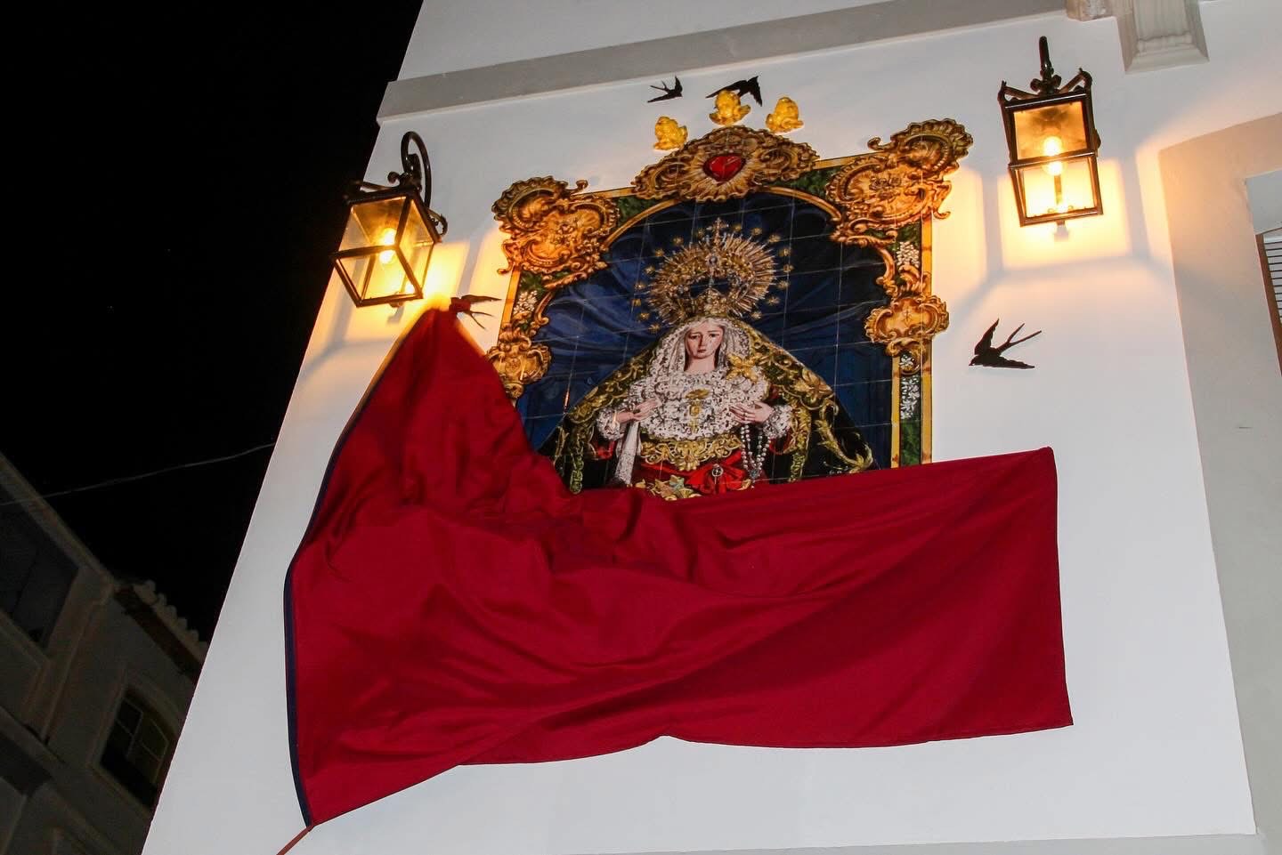 El retablo cerámico es una pieza única que muestra a la Virgen de los Dolores arropada por su altar, entre ángeles y flores, dándole profundidad y resaltando su figura en su manto negro con bordado dorado y su saya roja. La expresión de su divino rostro representada de la manera más acertada. «Un altar permanente en la calle, una oración hecha azulejo», estas fueron las palabras de nuestro Tercer Tte. Hermano Mayor, Dº. Juan Francisco Pérez García. Su intervención, así como la de la Hermana Mayor, María José Pérez Pérez; y el Rvdo. Sr. Dº. Felipe Manuel Gallego Casco, llegó a lo más profundo de las emociones de cada uno de los presentes.