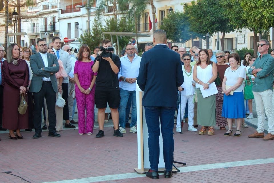 Tras ello y una eucaristía en la Iglesia de la Veracruz presidida por nuestro director espiritual y párroco de Álora, el Rvdo. Sr. Dº. Felipe Manuel Gallego Casco; el siguiente punto de encuentro era una ubicación del centro neurálgico y social de nuestro pueblo. Paso de muchos y entrada de todos, C/Carmona, una de las más concurridas. Allí, una tela roja cubría algo solemne y mantenía el misterio. Pasadas las 20:15, el secreto se hacía aplausos. Un mosaico conmemorativo del XXVº Aniversario de Coronación era presentado y bendecido, encargado de coronar ahora el acceso al centro urbano. Se trata de una obra del pintor y ceramista Dº. Javier Aguilar Cejas, natural de Córdoba y con una trayectoria envidiable.