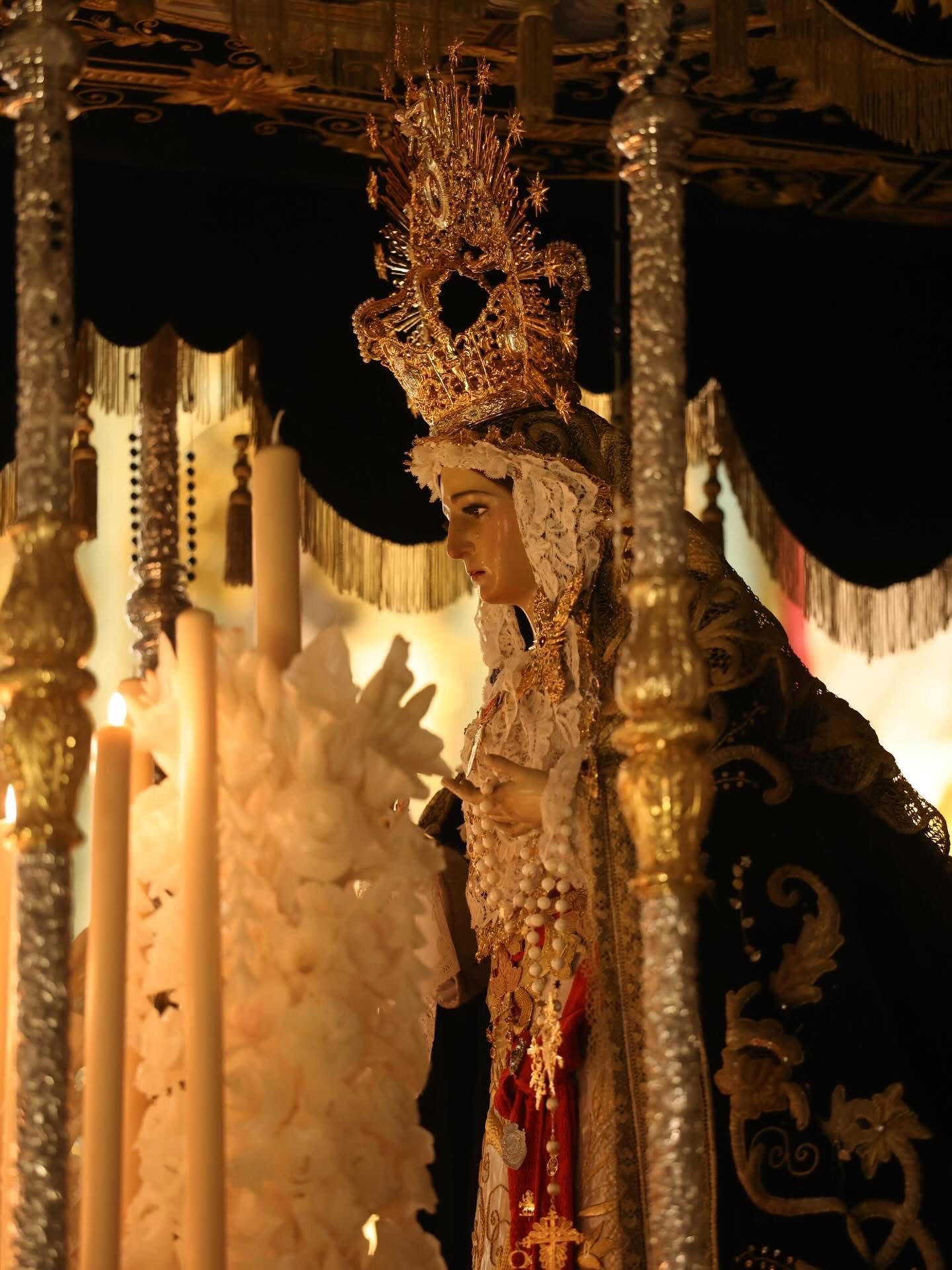Al llegar el momento de las ofrendas, además del pan y el vino, la actual Junta de Gobierno de nuestra Hermandad quiso obsequiar a la Amadísima Titular en esta importante fecha, ya preparada en su trono procesional, con una nueva corona de camarín.