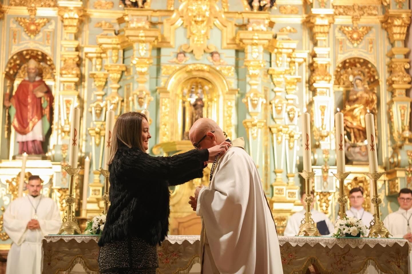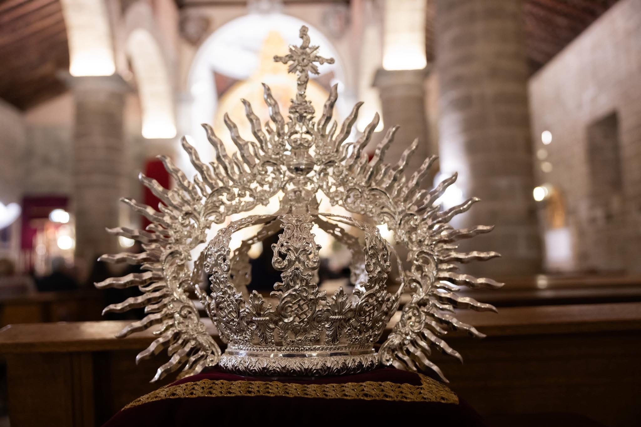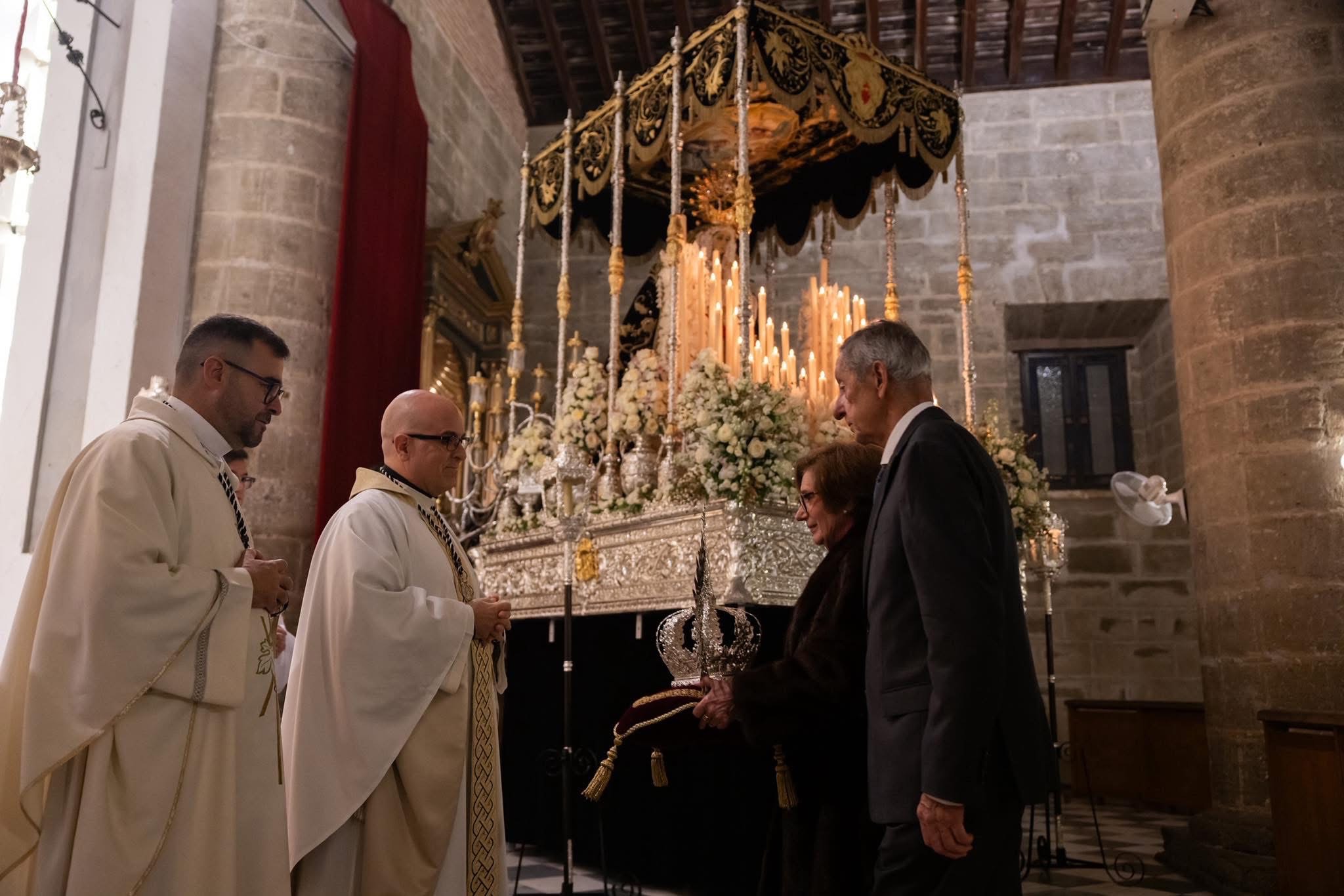 Al llegar el momento de las ofrendas, además del pan y el vino, la actual Junta de Gobierno de nuestra Hermandad quiso obsequiar a la Amadísima Titular en esta importante fecha, ya preparada en su trono procesional, con una nueva corona de camarín.