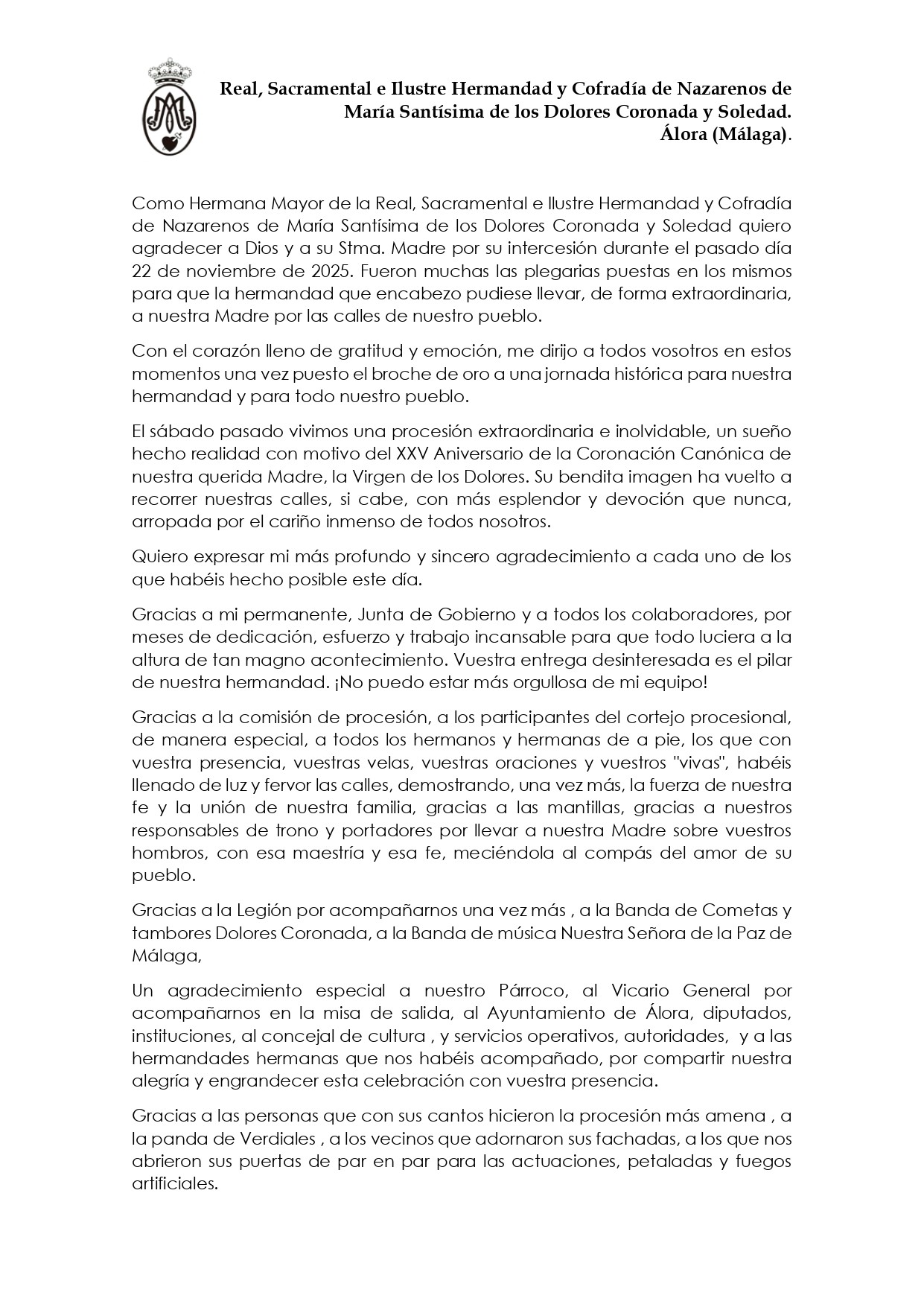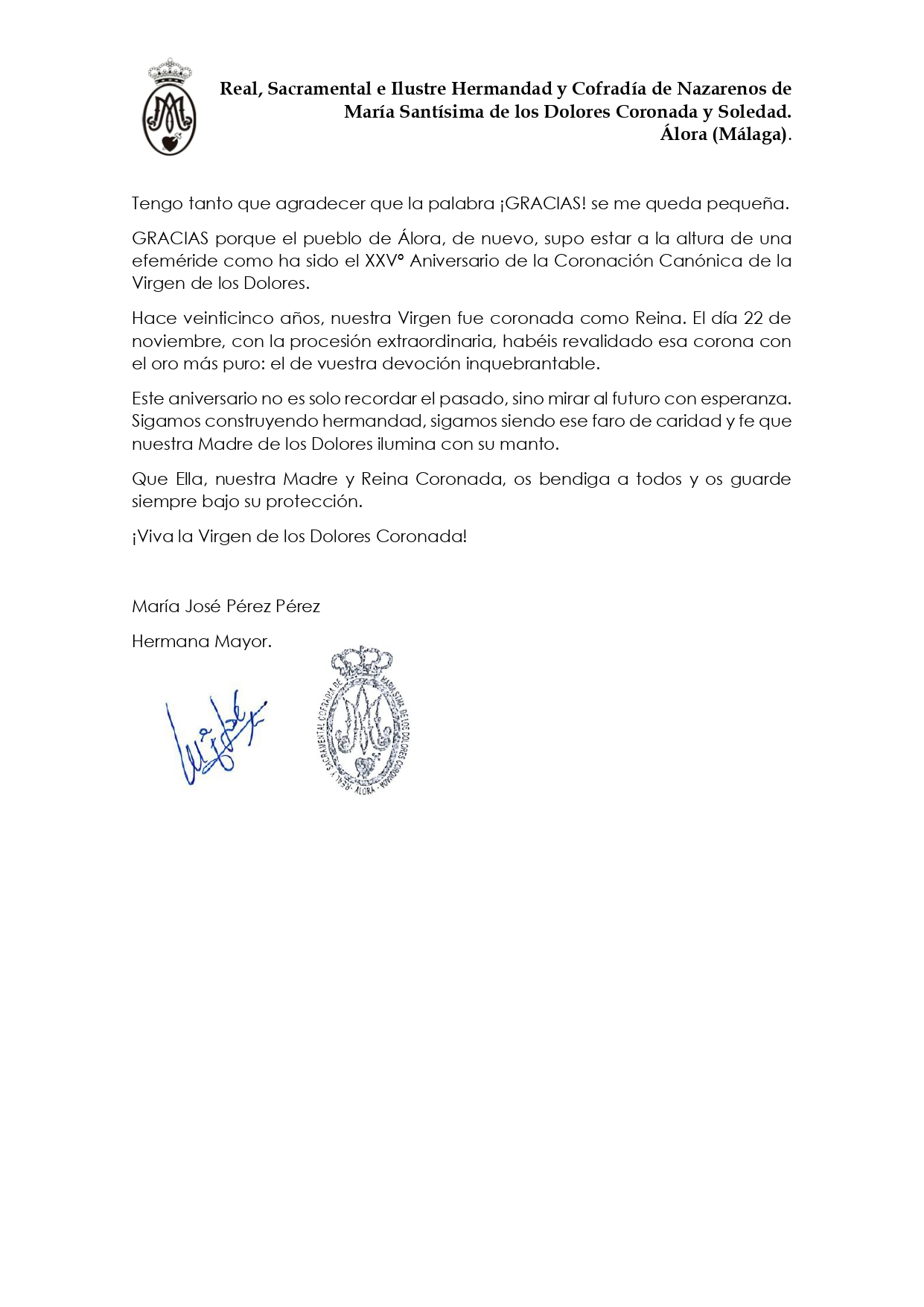 Los actos llevados a cabo con motivo del XXV Aniversario de Coronación Canónica de la Virgen de los Dolores ha pasado a la historia de nuestra Cofradía y al imaginario colectivo de nuestro municipio. Para que esto procediera así, ha sido necesario la labor desinteresada de muchas personas. Por consiguiente, nuestra Hermana Mayor, Dª. María José Pérez Pérez, desea expresar sus sentimientos y agradecimientos en la siguiente carta: